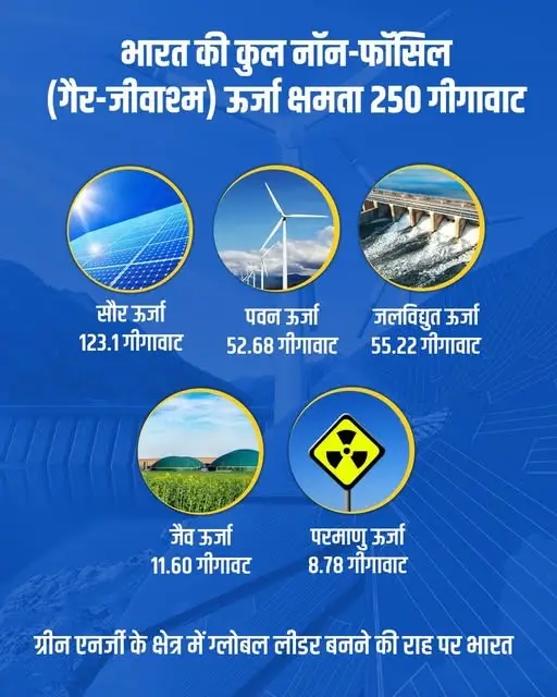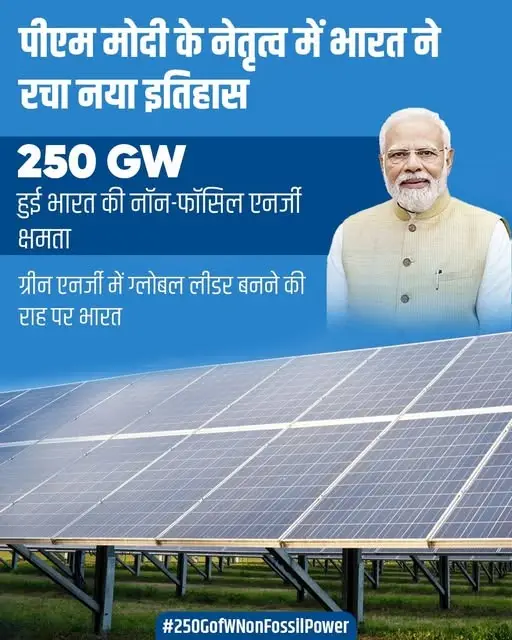 अब 250 गीगावाट नॉन-फॉसिल ऊर्जा क्षमता के साथ दुनिया में नई मिसाल। धन्यवाद पीएम @narendramodi जी, आपके विजन ने भारत को स्वच्छ ऊर्जा का लीडर बनाया।